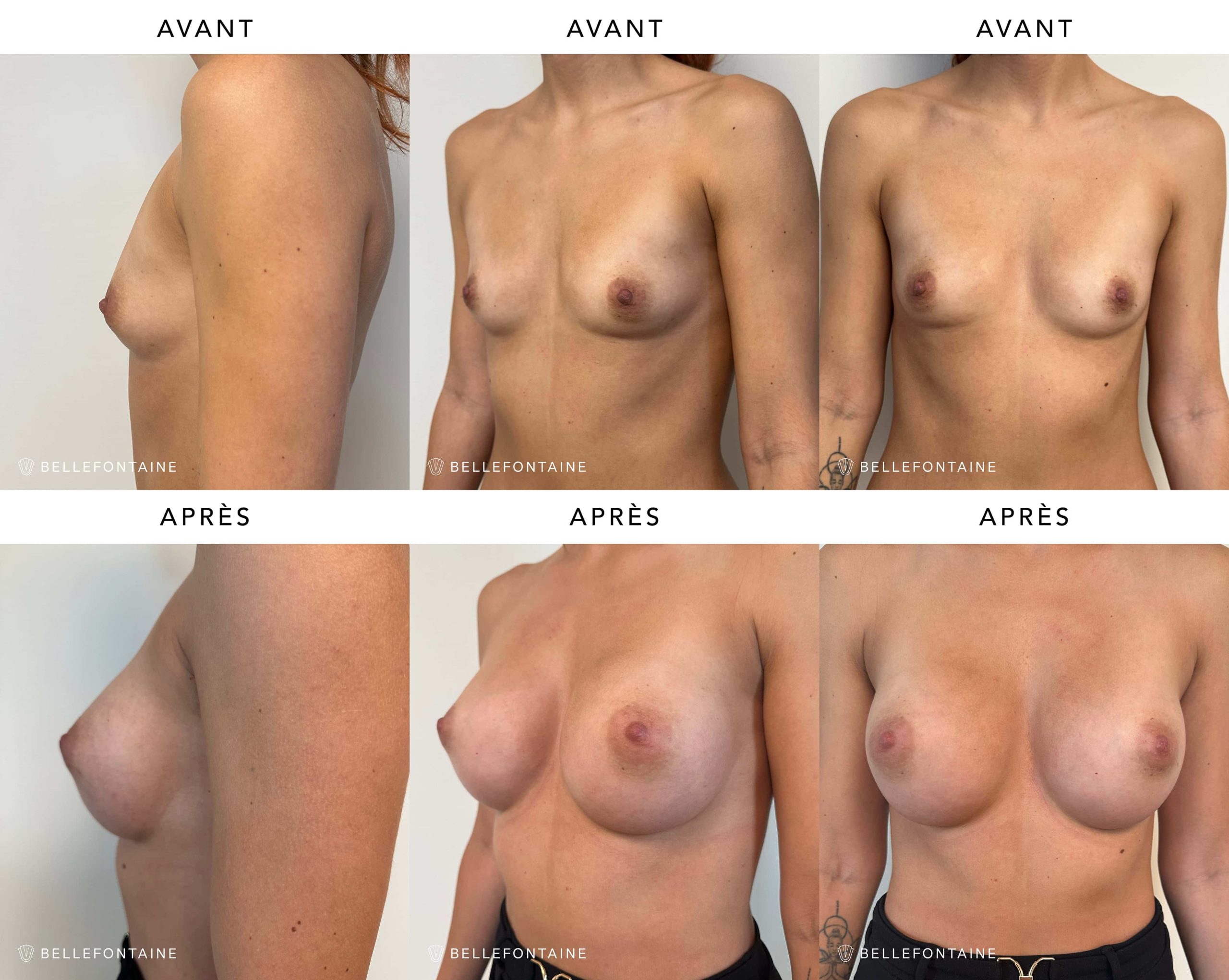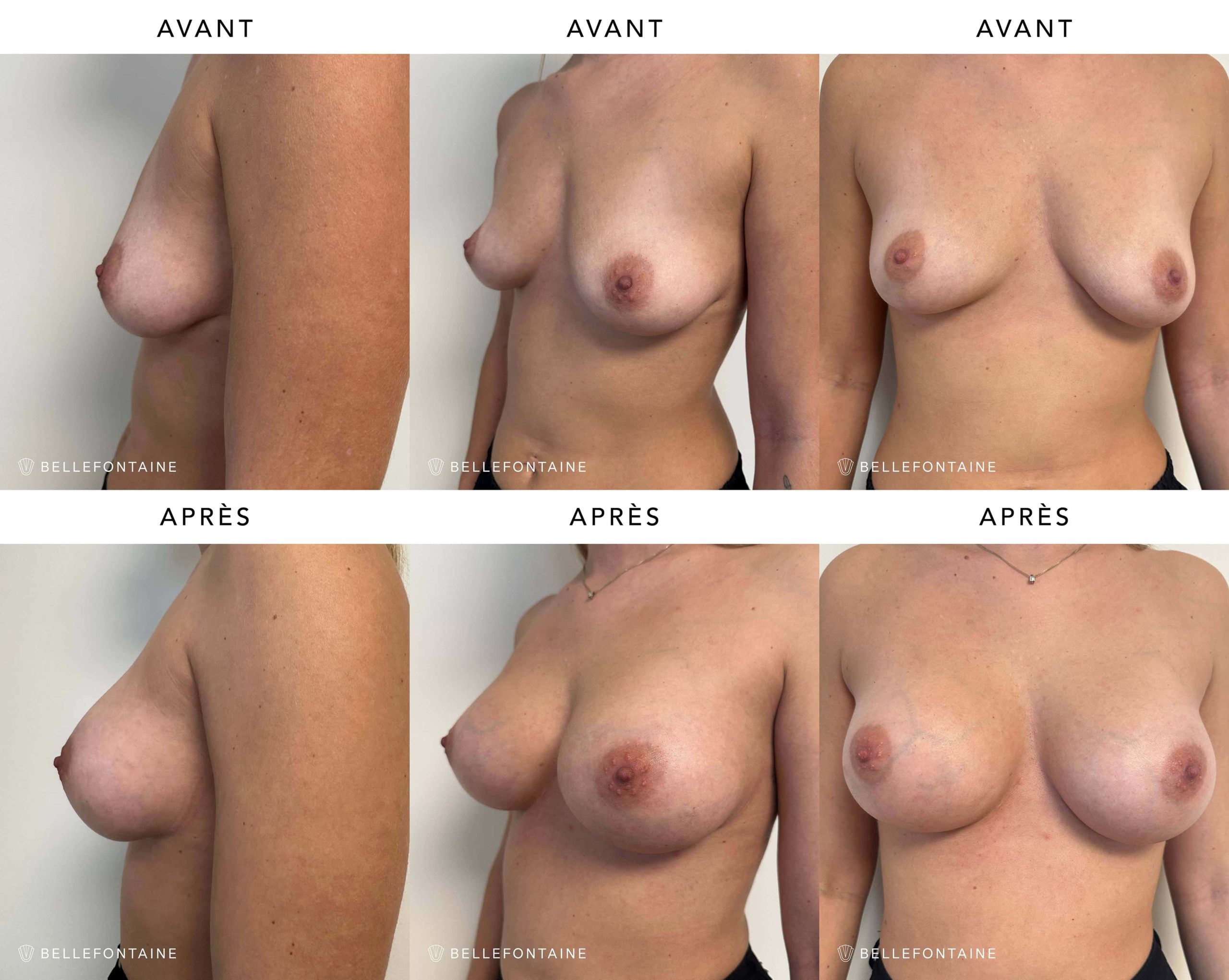 Vous décidez: Augmentation mammaire avec des implants, avec de la graisse ou composite. Des seins trop petits, légèrement pendants ou asymétriques, peuvent être corrigés avec des implants. Les prothèses de dernière génération se sont énormément développées et améliorées ces dernières années. Si la poitrine est corrigée à l’aide d’implants, une petite incision cutanée de 3 à 3,5 cm. est pratiquée en général le long de la face inférieure du sein. Pour satisfaire au mieux à votre demande, nous disposons de toute une gamme de prothèses que vous pouvez tester avant l’intervention. A la clinique Bellefontaine, vous avez la possibilité d’obtenir une augmentation mammaire avec une prothèse Motiva, une prothèse ronde ou une prothèse en forme de goutte « prothèse anatomique » qui s’adapte exactement à votre sein – soit une augmentation mammaire sur mesure. Nous recommandons en général une augmentation d’une à deux tailles de bonnet. Cela signifie que si vous portez actuellement un soutien-gorge avec un bonnet A, nous pouvons classiquement obtenir un bonnet C en agrandissant votre sein. Avec plus de 2 tailles de bonnet, le risque ultérieur de complications est plus élevé. En plus de l’augmentation mammaire par implants, nous proposons également l’augmentation mammaire par injection de votre propre graisse selon la technique de Beauli – le lipofilling mammaire. Pour les patientes qui ne souhaitent pas avoir d’implants dans leur corps et souhaitent avoir une augmentation légère à modérée, l’augmentation mammaire avec graisse autologue est la bonne méthode. Durant cette procédure, nous prélevons vos propres cellules graisseuses par liposuccion douce « Body Jet » dans une ou plusieurs régions du corps et les transplantons dans le sein. Dans certains cas, nous pouvons également proposer une augmentation mammaire composite qui est une technique consistant à combiner les deux méthodes décrites ci-dessus, soit l’implant et l’injection de graisse. Le lipofilling consiste à injecter de la graisse autour de l’implant pour en dissimuler les contours et de corriger les défauts de volume au niveau du décolleté.